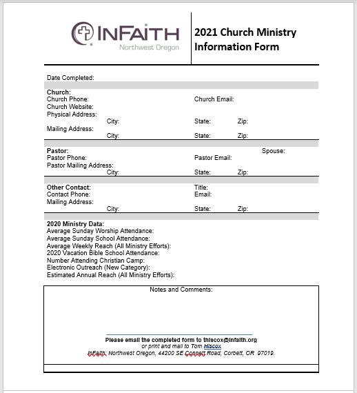 My annual report to the InFaith Home Office is due February 15. Some of the data from your 2021 Church Ministry Information form is needed for that report. A copy of that form is at this link. I can accept it by email, snail mail, or even a phone call. Your help is appreciated! Thank you to those churches who have sent in their information so far: Columbia Bible Church, The Church on the Mountain, Columbia Community Bible Church, Deer Island Community Church, Hudson Park Bible Church, Mayger-Downing Community Church, New Life in Christ Church, Shiloh Basin Community Church, Woodland Park Chapel. Help me let others know that the fellowship churches of InFaith: Northwest Oregon are reaching their communities with the love of Jesus!