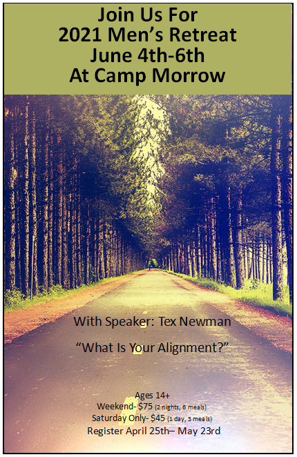 The men of The Church on the Mountain invite you to join them for their annual men’s retreat at Camp Morrow on Pine Hollow Reservoir, June 4-6 with guest speaker Tex Newman challenging us to check our alignments! Don’t miss out on a great weekend of food, fellowship, fishing, disc golf and recreation with other brothers in Christ. Click here for a registration form, or leave a message for Dave Boatman at TCOTM, 503-622-4079.