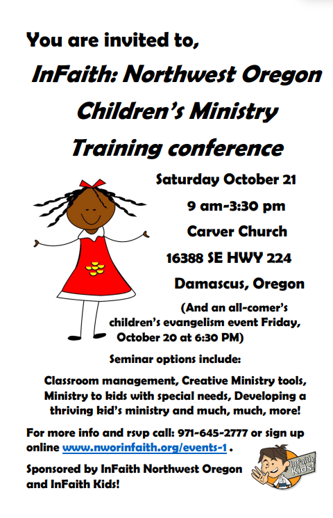 We are praising God for the folks from five churches who have already signed up to participate in this month’s InFaith: Northwest Oregon Children’s Ministry Conference, October 20-21 at Carver Church. We are praying there will be several more! All the workshops and the children’s outreach event on Friday night are provided free. But Pre-registration is very important, so we can be ready to serve you. If you plan to come, please register online ASAP at https://www.nworinfaith.org/events-1/2023/8/31/infaith-northwest-oregon-childrens-ministry-training-conference or call me and I will sign you up.