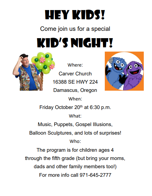 Friday night’s outreach event is a one-hour presentation of the Gospel by illusionist, puppeteer, balloon sculptor, evangelist Brett Belleque and his team. It will be a great opportunity for your kids to hear about Jesus in a safe, fun environment.